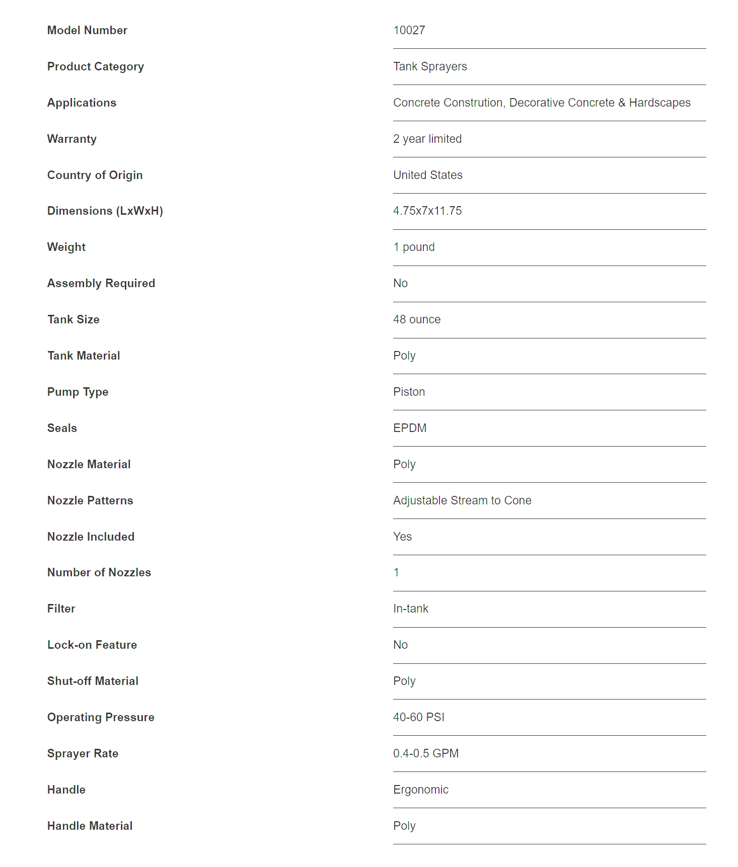 The Chapin 10027 48-ounce industrial acetone staining sprayer is specifically equipped for the decorative concrete professional. It’s designed for use with acetone-based dyes used in concrete applications. The seals are acetone-resistant and the 48-ounce chemical-resistant, polyethene bottle is translucent so you can see the liquid level while you’re working. It features an adjustable cone nozzle to switch between a shower and a stream and the in-tank filter limits clogs. Protected by Chapin’s 1-year limited warranty and made in the USA with global materials.