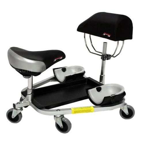 The Racatac Kneeling/ Sitting Creeper w/ 3-inch Caster & Chest Support is fully adjustable and made with a comfortable dual-density foam with attachable parts that connect and disconnect in seconds. Both the seat and chest support adjust at different angles, heights, and slide back and forth. This allows both hands to be free to work in any position, while your back and knees are on supports.The 3-inch caster model is 1-inch higher off of the floor and allows your feet easier movement at a much quicker rate in a kneeling or sitting position. This model helps you move rather quickly in a lateral position and can be used on rough surfaces. Great for edging, grinding, polishing jobs. Instead of sitting back on your heels, the fully adjustable seat provides upper body support, leaving your feet free to control your movement.